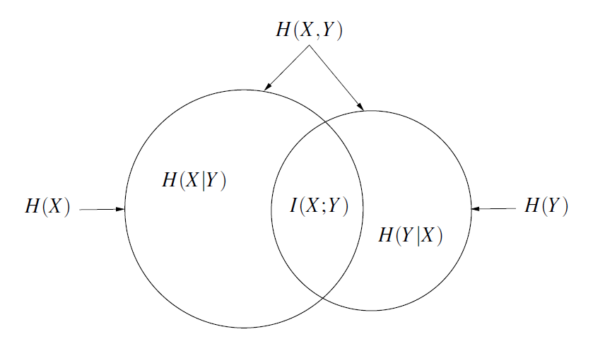 条件熵衡量了信道引入的不确定性。不难发现:在无损信道中转移概率矩阵 $P_{Y|X}(y_j|x_i)$ 是单位矩阵,条件熵 $H(Y|X)=0$;而在完全噪声信道中(即接收到的信号与发送的信号独立),$P_{Y|X}(y_j|x_i)=P_Y(y_j)$,条件熵 $H(Y|X)=H(Y)$。