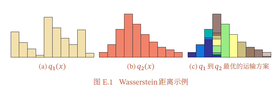 为了解决这个问题,研究者们提出了 $\mathrm{Wasserstein}$ 距离。它的形式化定义比较复杂,但可以直观地理解为:如果将两个分布看作两个土堆,那么 $\mathrm{Wasserstein}$ 距离就是将一个土堆变成另一个土堆所需搬运的最小工作量。就比如下图所示: